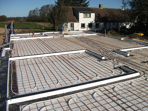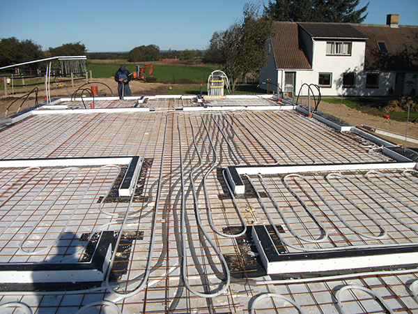 Der er klar til at blive støbt bund i huset. Læg mærke til at gulvvarmestrengenes tilledninger er isoleret og skåret
