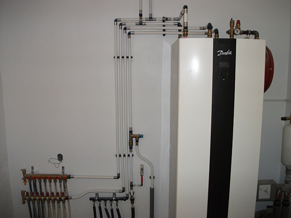 Her er varmepumpen fra Thermia (tidl. Danfoss) tilsluttet fordelere til gulvvarme og brugsvand. 180L varmtvandsbeholder er indbygget bag kabinet.